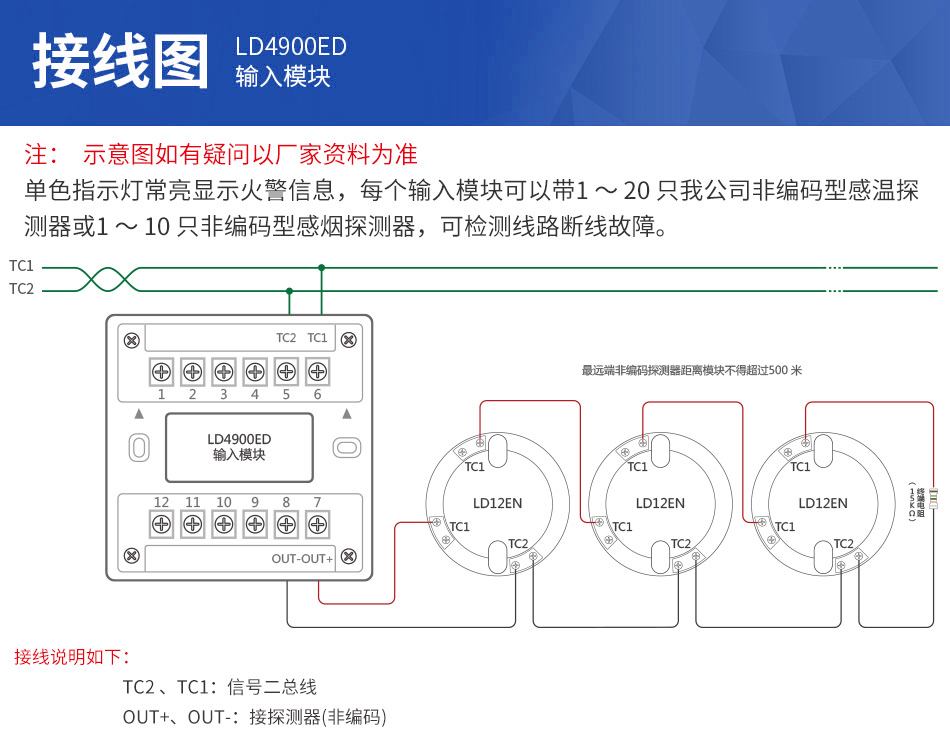 1、LD4900ED輸入模塊為二總線,無(wú)極性。 2、采用電子編碼,占一個(gè)節(jié)點(diǎn)地址(0~255)。 3、單色指示燈常亮顯示火警信息。 4、每個(gè)LD4900ED輸入模塊可以帶1~20只利達(dá)公司非編碼型探測(cè)器。 5、LD4900ED輸入模塊可檢測(cè)線路斷線故障。