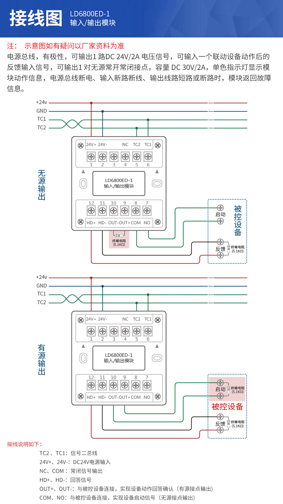 LD6800ED-1輸入/輸出模塊與E/EN/EL系列火災報警控制器配合使用。LD6800ED-1輸入/輸出模塊通過二總線與E/EN/EL系列控制器連接,控制器通過二總線查詢模塊節點狀態、設置模塊節點參數、控制模塊啟動輸出;模塊實時檢測輸入信號、輸入/輸出線路狀態,當出現反饋輸入或者輸入/輸出線路故障時,模塊通過二總線上傳反饋或者故障信號。