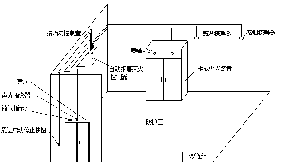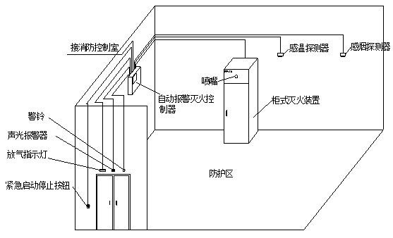 當(dāng)兩種探測(cè)器發(fā)出火災(zāi)信號(hào)時(shí),控制主機(jī)啟動(dòng)警鈴和聲光報(bào)警器,聯(lián)動(dòng)關(guān)閉防護(hù)區(qū)開(kāi)口,進(jìn)入滅火啟動(dòng)延時(shí),達(dá)到設(shè)定的延時(shí)時(shí)間后,自動(dòng)啟動(dòng)滅火裝置。