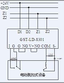 1.模塊通過有源輸出直接驅動一臺排煙口或防火閥等(電動脫扣式)設備的接線示意圖如圖2- 33 (無源常開檢線輸入)、圖2- 34所示(無源常閉檢線輸入):