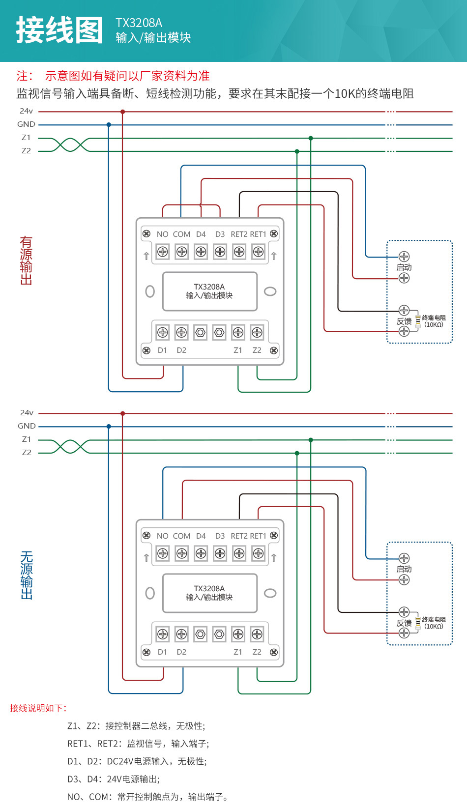 注意:模塊的反饋輸入端具備斷、短線檢測(cè)功能,要求在其末端配接一個(gè)10K的終端電阻,否則控制器將報(bào)出該產(chǎn)品反饋端故障;對(duì)于控制線也具備斷、短線檢測(cè)功能,當(dāng)模塊不動(dòng)作時(shí),要求常開(kāi)輸出端的電壓在DC12-48V之間,否則控制器將報(bào)出該模塊輸出線故障。